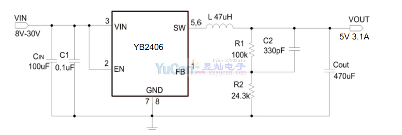 YB2406是支持高電壓輸入的同步降壓電源管理芯片,在8~30V的寬輸入電壓范圍內(nèi)可實(shí)現(xiàn)3.1A的連續(xù)電流輸出。通過調(diào)節(jié)FB端口的分壓電阻,可以輸出1.8V到28V的穩(wěn)定電壓.YB2406具有優(yōu)秀的負(fù)載調(diào)整率和線電壓調(diào)整率,在全范圍內(nèi)不超過±3%。YB2406采用電流模式的環(huán)路控制原理,實(shí)現(xiàn)了快速的動(dòng)態(tài)響應(yīng).YB2406工作開關(guān)頻率為130kH,具有良好的EMI特性。